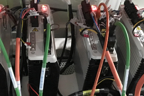 欧姆龙PLC,EtherCAT实时工业以太网总线控制 – 核心控制使用4套ABB伺服控制系统,跟随主轴(虚轴)实现1轴位置同步,3轴电子凸轮运行